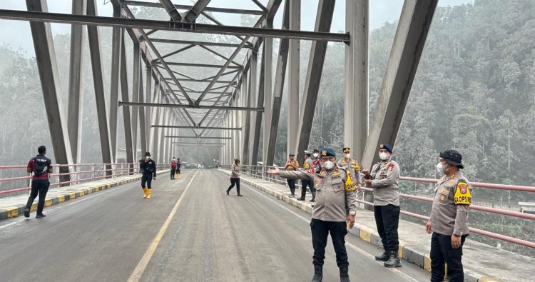 Personel Polri yang berjaga mengingatkan warga agar tetap waspada terhadap potensi bahaya, seperti aliran lahar dingin, material vulkanik, serta kondisi tanah yang labil di sekitar bantaran sungai.