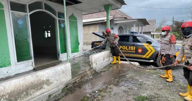 Personel Polres Lumajang bersama Satbrimob dan Samapta Polda Jawa Timur melaksanakan pembersihan beberapa fasilitas ibadah dan rumah warga di wilayah terdampak.