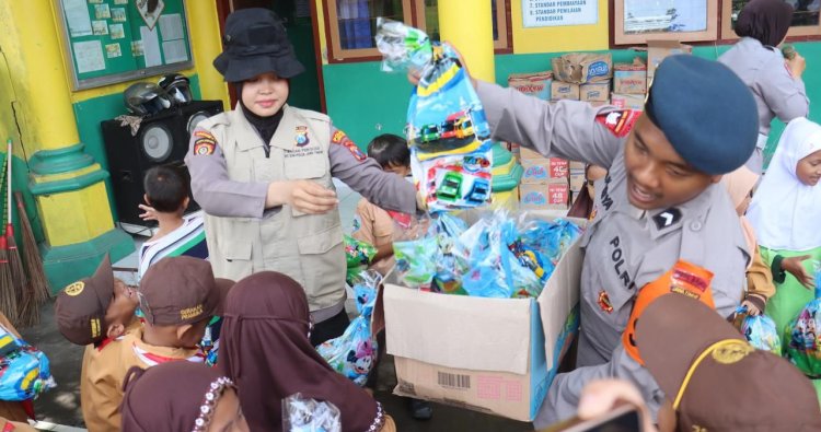 Polwan dan personel Brimob membuat suasana menjadi penuh tawa dengan kegiatan interaktif yang mengajak siswa bergerak, bernyanyi, dan bermain bersama.